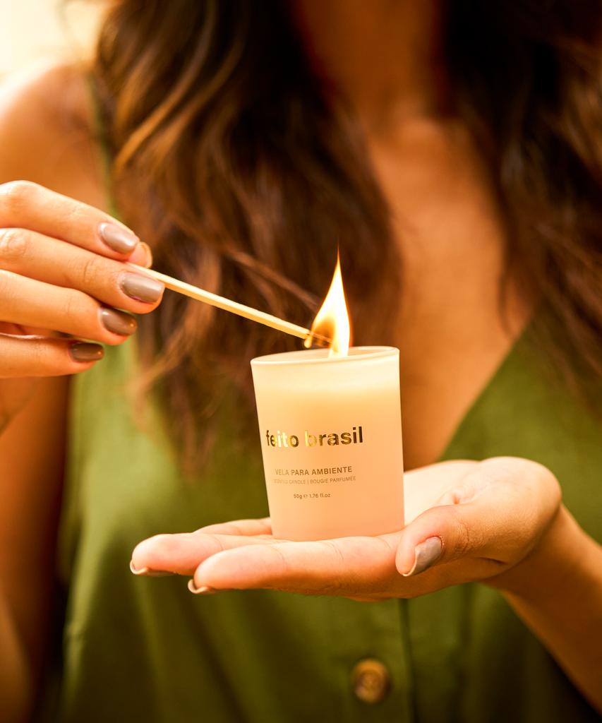 Retire a vela da caixa antes de acendê-la. Sempre que desejar aromatizar o ambiente, acenda o pavio e mantenha a vela em uma superfície plana. Após o uso, apague o pavio.