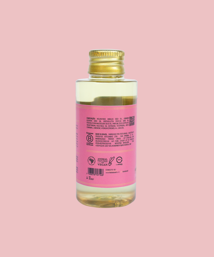 Esse óleo proporciona uma excelente penetração, nutrindo e hidratando profundamente a pele. Com um toque seco, ele deixa a pele macia e suave, sem deixar resíduos oleosos. Sua fórmula de clean beauty é livre de matéria indesejada e contém ingredientes poderosos como os óleos de Pracaxi, Babaçu e Castanha, além de Vitamina E.