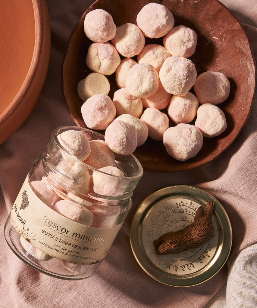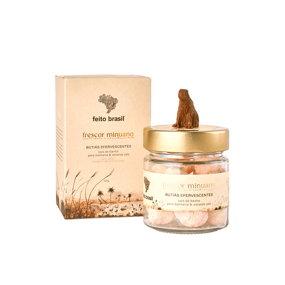 Para um momento purificante de banho! O Frescor Minuano traz a energia dos Butiás para uma experiência efervescente na banheira ou no escalda-pés.