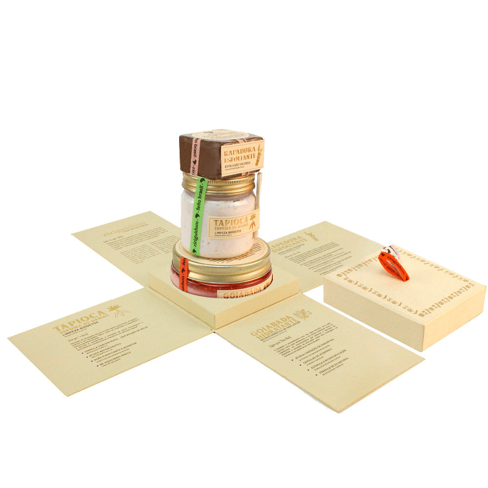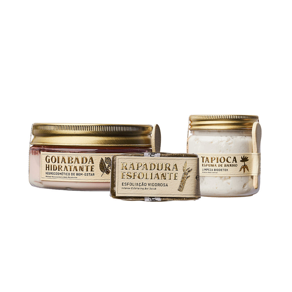 Rapadura Esfoliante (90g): esfoliante corporal sólido em formato inovador de rapadura, promove uma esfoliação vigorosa, removendo as células mortas. Os ativos naturais acalmam e mantêm a pele hidratada por até 4 horas após a aplicação.