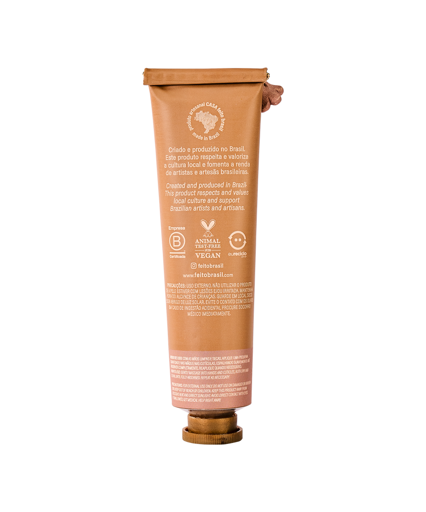 Cada embalagem acompanha uma peça única de cerâmica, feita à mão pelas talentosas artesãs de Cachoeira do Fanado, acrescentando um toque de autenticidade e valor cultural ao seu cuidado diário com as mãos.