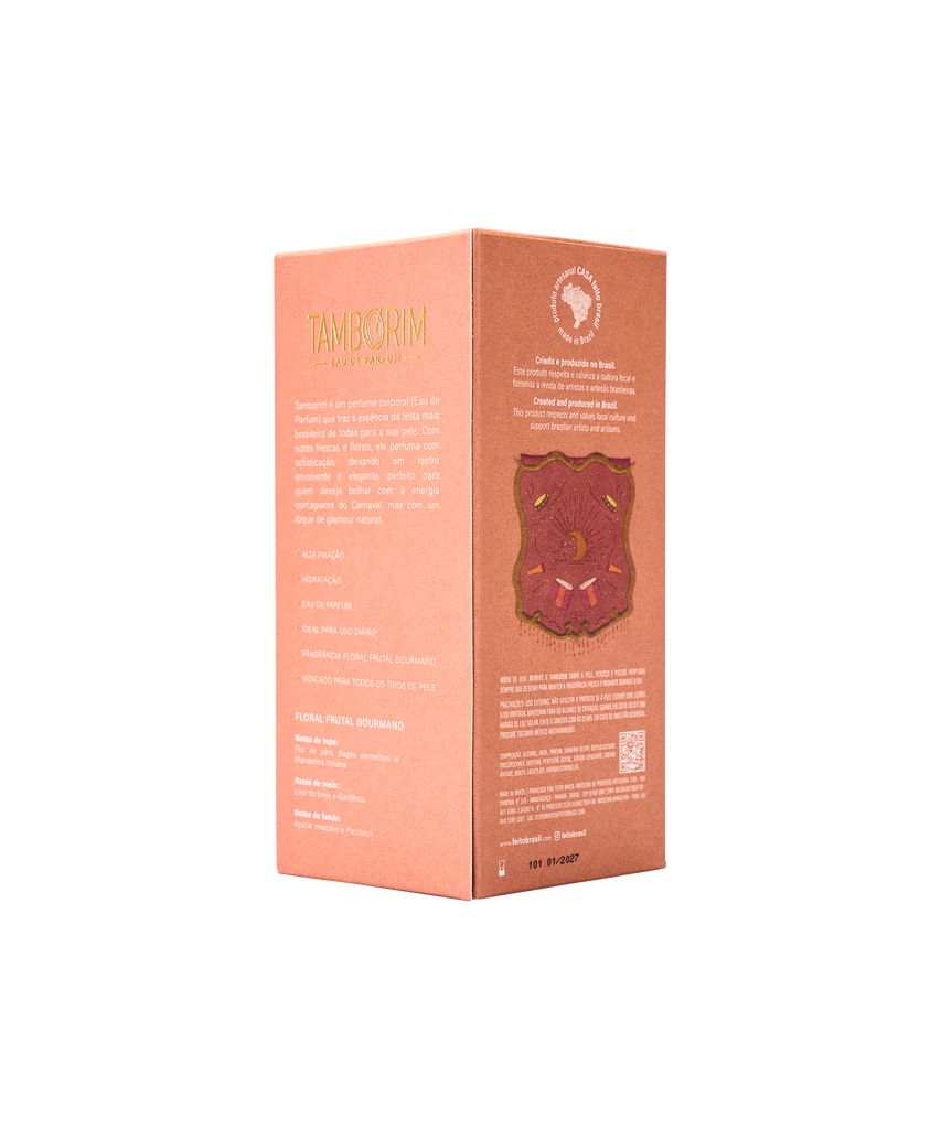 Tamborim é um perfume corporal (Eau de Parfum) que traduz a energia vibrante e sofisticada do Carnaval para sua pele. Com notas frescas, florais e gourmand, ele envolve os sentidos com uma fragrância marcante e envolvente, ideal para quem deseja irradiar alegria e glamour. Sua composição proporciona alta fixação e um perfume duradouro, perfeito para todas as ocasiões.