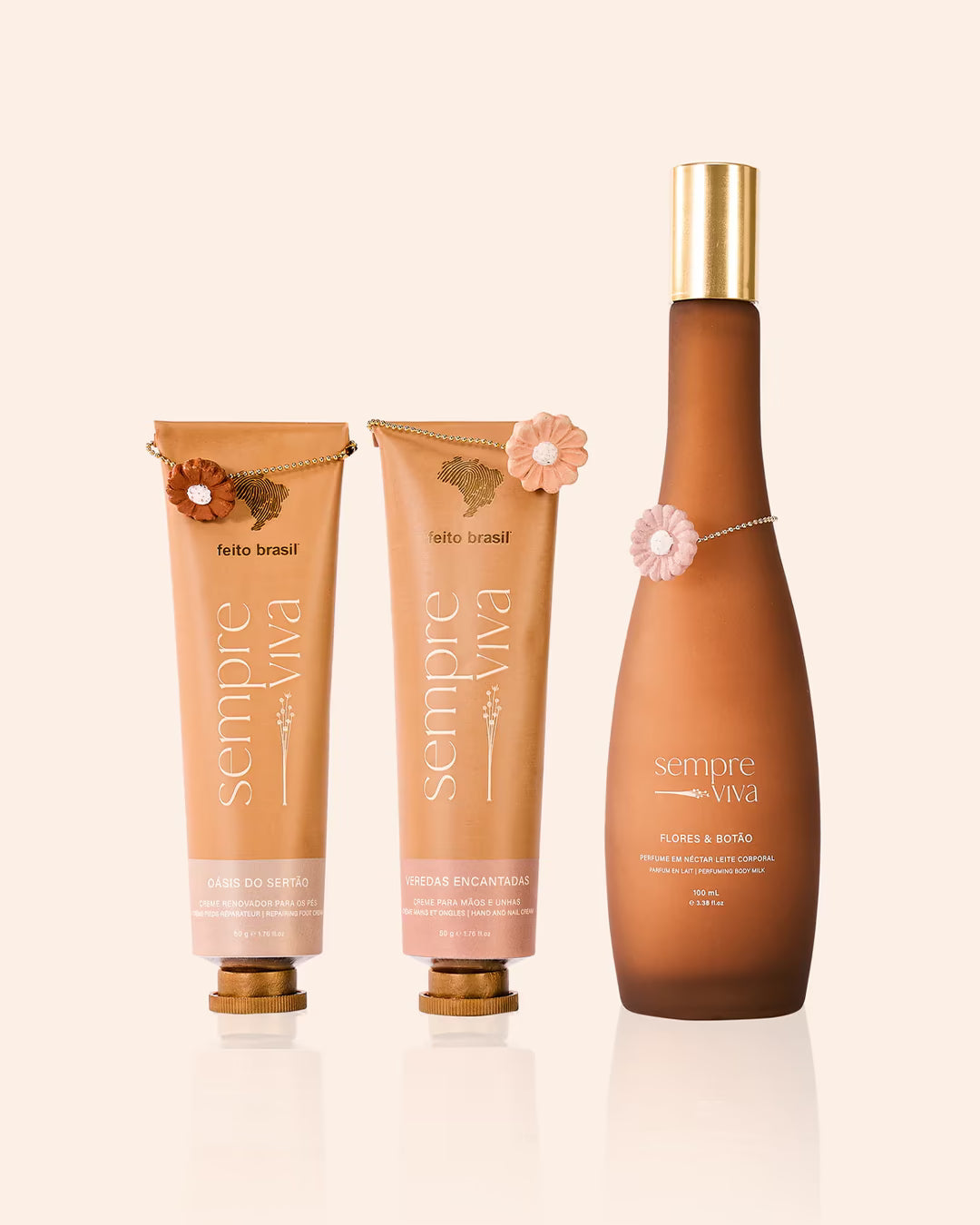 Um ritual completo de hidratação que cuida de mãos, pés e corpo, deixando a pele nutrida, macia e protegida. Fórmulas enriquecidas com Extrato de Sempre-Viva, Óleo de Algodão e Manteiga de Karité oferecem nutrição profunda e sensação de conforto duradoura.